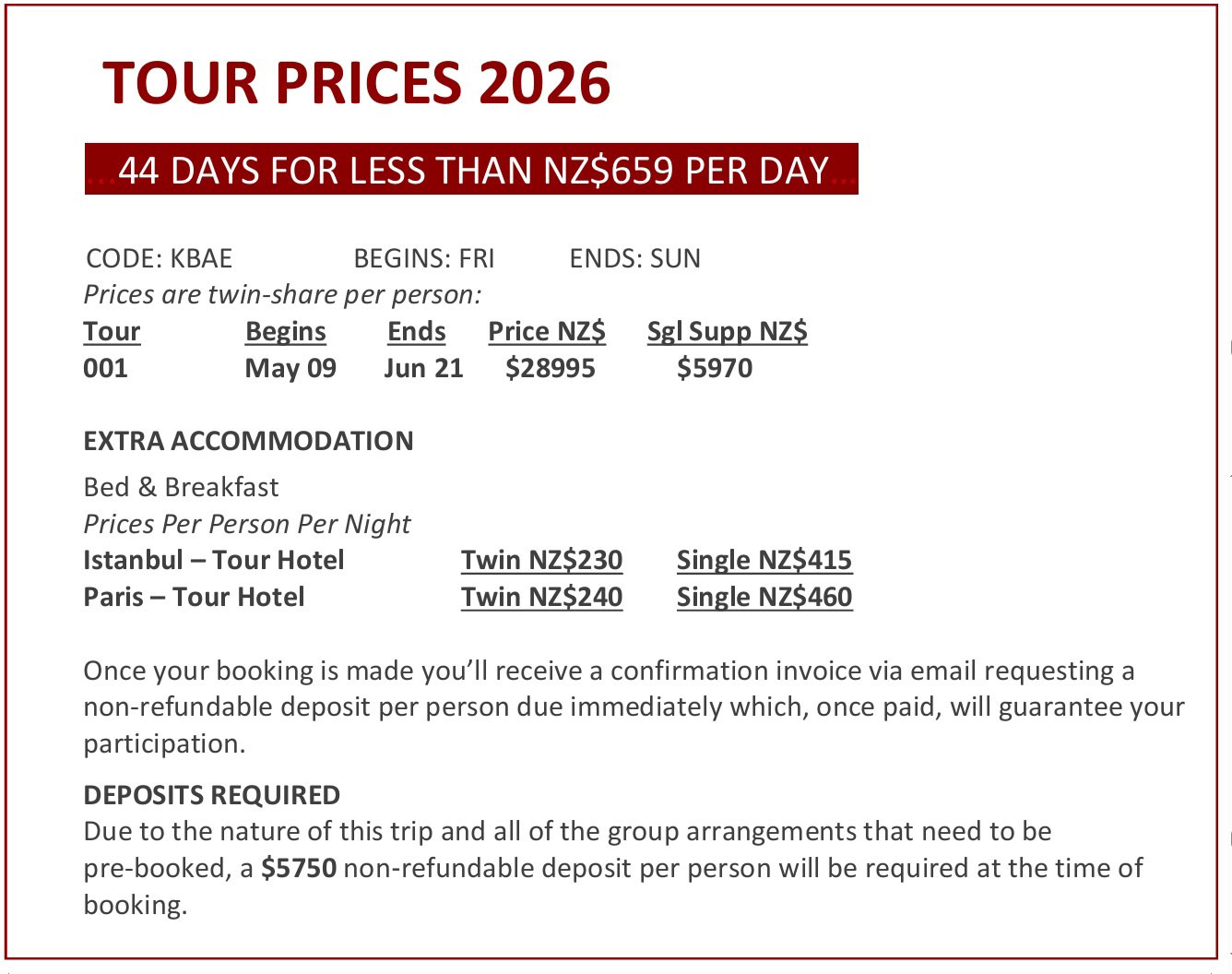 TOUR FLEXIBILITY- The Turkey/Egypt, and/or Greece sectors of the ANZAC Europe Tour can be treated as separate tour options if required. Please contact Paul for further information and pricing.