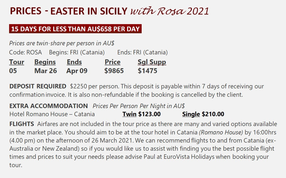- This carefully-crafted special itinerary provides for a comprehensive but leisurely-paced programme of sightseeing, daily excursions, scenic drives and privately guided tours, highlighted by attendance at three of the most famous Sicilian Easter festivals...the Procession of the Mysteries of Trapani (Misteri di Trapani), the Arbėreshė Procession in Piana degli Albanesi and the Dance of the Devils (Ballo dei Diavoli) in PrizziFully escorted by Rosa and Colin, with additional services in Sicily from a professional Tour Manager and additional expert commentary by local guides during tours and visits while in Piazza Armerina (Villa del Casale), Agrigento (Valley of the Temples), Monreale, Palermo and SyracuseA limit on tour numbers to a maximum of 18 guests ensures a greater level of comfort and individual attentionStart each day with a delicious buffet breakfast (B)On 7 special days savour pre-arranged highlight lunches, three particularly special ones being a long lunch at the exclusive Tenuta Manca di Geracello near Piazza Armerina, a 'Cooking Class' lunch with Rosa at her favourite restaurant in Modica and a 'Farewell Lunch' at a Michelin-starred restaurant in the beautiful town of Noto (L)6 evening meals are provided, with wine, including a welcome dinner in Catania and a dinner in each of Rosa's favourite restaurants in the Piazza Armerina area (2), Marsala, Palermo, and Syracuse (D)Experience the delightful tastes of the Sicilian Easter Festivals with dishes like Torta Pasqualina (Easter Pie) and Agnello Agrassato (Lamb Stew) or Mpanata (Lamb Pie). Enjoy the famous Easter treats such as Cuddura (hard boiled eggs nestling on animal or basket shaped pastries, traditionally made by the Nonnas and gifted to their grandchildren) and Colomba Pasquale (Panattone-style Easter bread baked in the shape of a dove). Try the iconic Easter gift, Agnelli Pasquali (Spring lambs fashioned from marzipan and filled with pistachio paste)Stay in quality accommodation, in boutique-style, premium city hotels or intimate family-run establishments with a special highlight of a 2-night stay at an 'Agriturismo' property in the Piazza Armerina areaTravel in comfort and style in deluxe air-conditioned vehicles throughout, with private transfers on arrival and departureAnd, you won’t have to tip on this tour. The Easter in Sicily with Rosa tour has a unique 'No Tipping' policy which means we take care of hotel porterage, hotel and restaurant service charges (for meals included in the programme) plus taxes and gratuities, including gratuities for local guides and the end-of-tour gratuities traditionally given to the Tour Manager and Driver