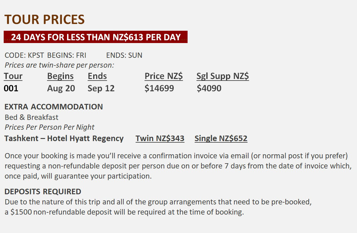 WHAT'S NOT INCLUDED- International airfares (to and from Tashkent) and departure taxesVisa costsTravel Insurance (Compulsory)Items of a personal nature such as phone calls, laundry etc.All other expenses not expressly mentioned in the programme